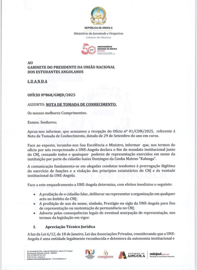 A decisão é sustentada por um documento do Ministério da Juventude e Desportos (Minjud), datado de 13 de Outubro de 2025, que confirma o fim do mandato institucional da UNE-Angola junto do CNJ e reconhece a cessação de todos os poderes de representação anteriormente exercidos por Kalunga.