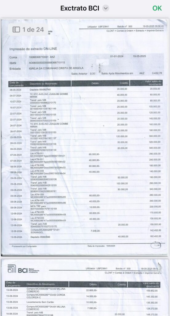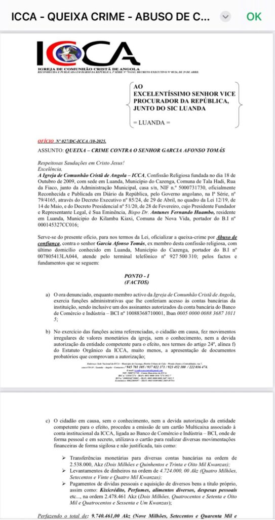 De acordo com o Ofício n.º 027/DC-ICCA/10-2025, em posse deste JORNAL, Garcia Tomás ou simplesmente Bispo Abraão, que durante vários anos exerceu funções administrativas na ICCA, teria realizado movimentações bancárias não autorizadas e utilizado um cartão Multicaixa associado à conta institucional do Banco de Comércio e Indústria (BCI), com retiradas e transferências superiores a 9,7 milhões de kwanzas.