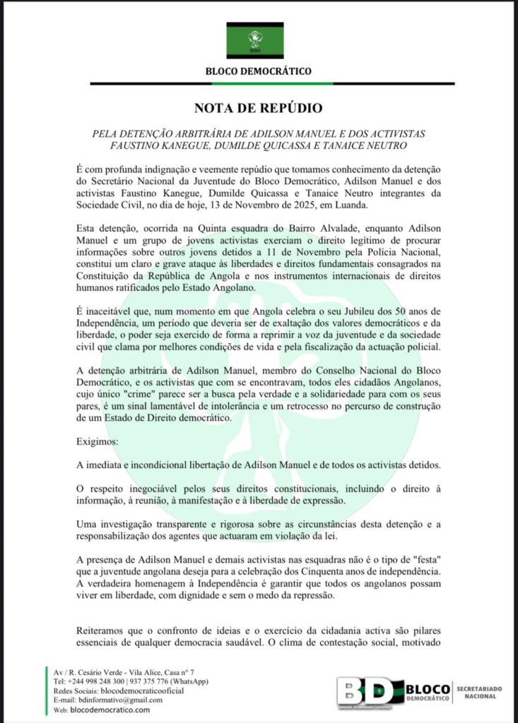 O Bloco Democrático (BD) manifestou, nesta quinta-feira, 13 de Novembro de 2025, “profunda indignação” pela detenção do seu Secretário Nacional da Juventude, Adilson Manuel, e de três activistas da sociedade civil, Faustino Kanegue, Dumilde Quicassa e Tanaice Neutro, ocorrida na 5.ª Esquadra do Bairro Alvalade, em Luanda, enquanto procurava obter informações sobre jovens detidos a 11 de Novembro pela Polícia Nacional.