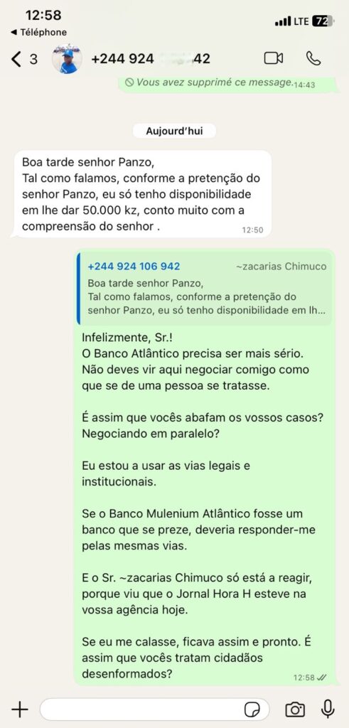 O banco, de acordo com informações apuradas pelo Jornal Hora H, dias depois, pagou cinquenta mil kwanzas ao cliente como forma de compensação. Os 25.000 kwanzas restantes deverão ser entregues no dia 22 de Dezembro, conforme declarou o denunciante.