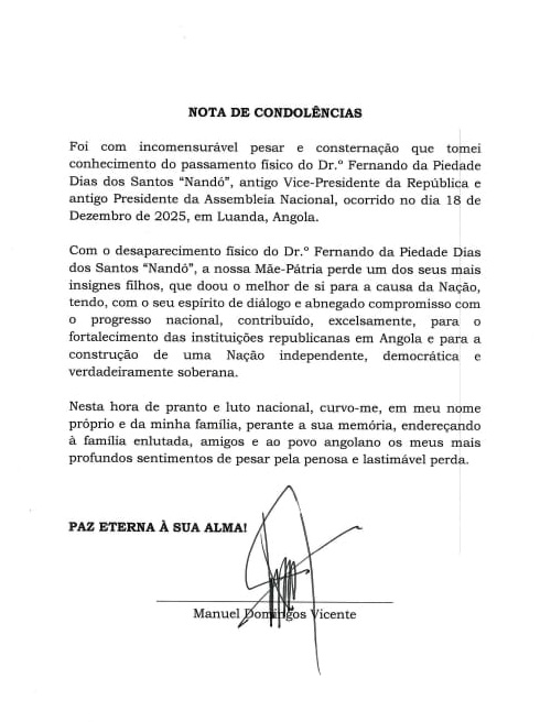 Foi com incomensurável pesar e consternação que tomei conhecimento do passamento físico do Dr.° Fernando da Piedade Dias dos Santos “Nandó”, antigo Vice-Presidente da República е antigo Presidente da Assembleia Nacional, ocorrido no dia 18 de Dezembro de 2025, em Luanda, Angola, diz a nota de condolencias enviada nesta sexta-feira, 19, a redacção do jornal Hora H.
