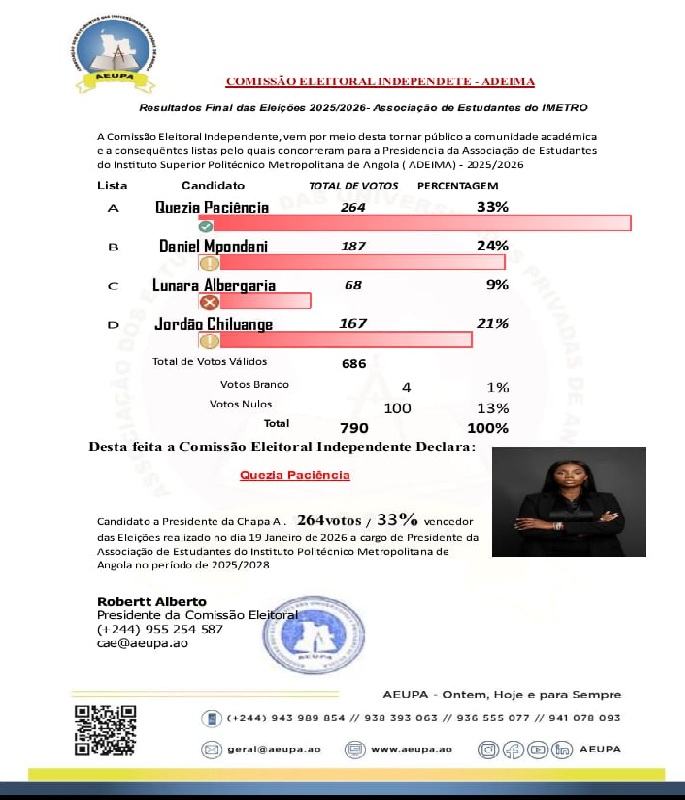 Os estudantes do Instituto Superior Metropolitano de Angola (IMETRO), em Luanda, denunciaram nesta quinta-feira, 22, alegadas irregularidades consideradas “graves” no processo eleitoral para a escolha da nova direcção da Associação de Estudantes daquela instituição de ensino, apontando indícios de fraude, manipulação de votos e interferência política.