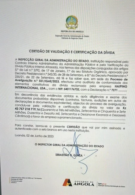 Para o pagamento da dívida pública falsa,  Pedro Makita,  Ângela Diogo e o cidadão chinês ZHANG HAIPING ,terão  contado com o beneplácito do actual presidente do Tribunal de Contas, Sebastião Domingos Gunza, enquanto Inspector-Geral do IGAE, certificou a primeira parcela da dívida no valor 43.757.218.719,16 ( Quarenta  e três mil milhões, setecentos e cinquenta e sete milhões, duzentos e dezoito mil , setecentos e dezanove kwanzas e dezsseis cêntimos), a favor da empresa HAIPING INTERNACIONAL, LDA com NIF 5401176732, fazendo recurso ao processo nº 031/IGAE/2023,  da averiguação feita supostamente por técnicos do IGAE, todavia a fonte informou a NSISA REFLEXÕES que,   na província do Zaíre  não fez-se  trabalho de averiguação destas obras e não seria possível, porque a empresa em referência nunca celebrou contrato com o  governo provincial  e nem prestou serviço para obras de terraplanagem.