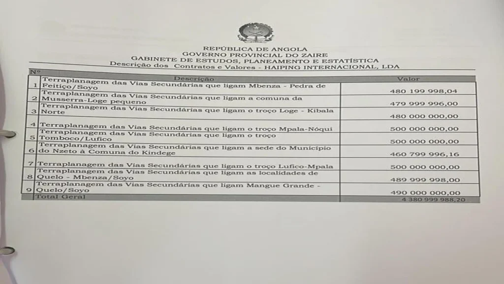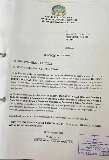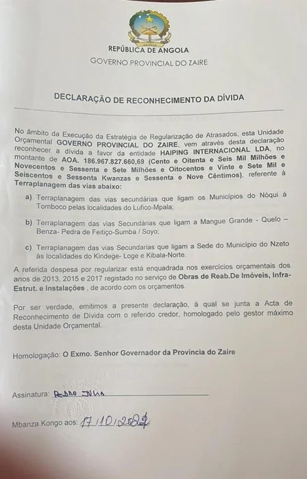 Segundo consta na declaração de reconhecimento da dívida  assinada pelo antigo governador do Zaíre, Pedro Makita, aos 17 de outubro de 2022, a   dívida bilionária  que a empresa HAIPING INTERNACIONAL, LDA cobra ao estado angolano,  é referente  a terraplanagem das vias secunndárias que ligam os municípios do NOQUI – Tomboco,  localidade de Mangue Grande – município do Quelo e Benza-Pedra de Feitiço – Sumba no Soyo, vias  secundárias que ligam o Município sede  do Nzeto às localidades do Kindege -Loge  e Kibala do Norte.  Dívida é resultante  dos exercícios governativos  dos anos 2013, 2015 e 2017  registados no serviço de obras de reabilitação  de imóveis, infra-estruturas e instalações.