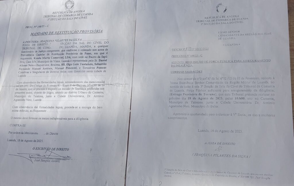 Recentemente, um grupo de supostos efectivos do SIC-Luanda e da Polícia de Ordem Pública deslocou-se ao terreno da empresa Konda Marta, alegadamente para executar um “mandado de apreensão do imóvel”, mesmo tendo sido restituído à empresa por decisão do Tribunal da Comarca de Luanda, em Agosto de 2025, como fez saber o assessor jurídico da empresa em referência Joaquim Kapratos.